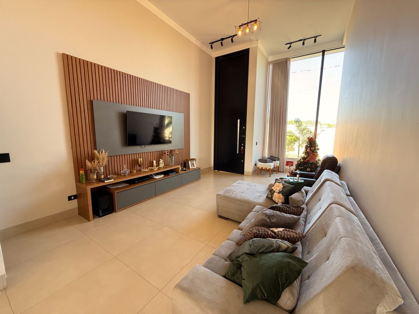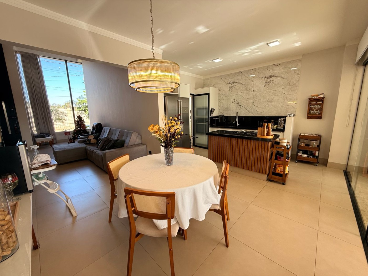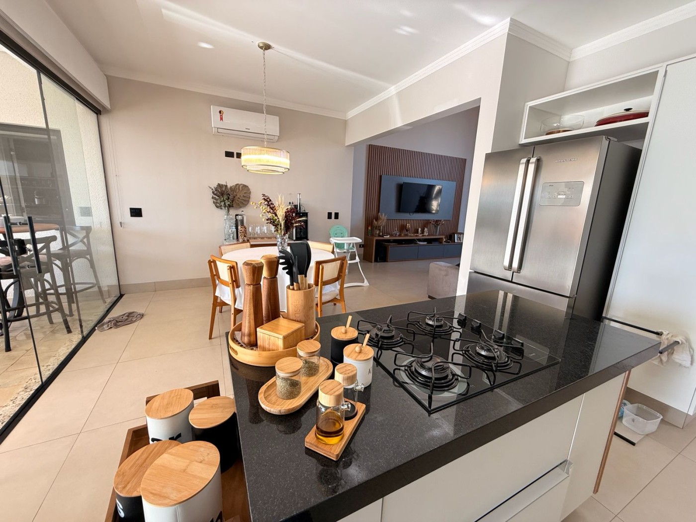 Casa ampla e sofisticada, projetada para oferecer conforto e praticidade. A sala principal possui pé-direito alto, destacando-se pela sensação de amplitude e luminosidade. Conta com painel e rack planejados, integrando-se perfeitamente à sala de jantar e à cozinha, que dispõe de uma ilha com cooktop e armários planejados, ideal para quem busca um ambiente