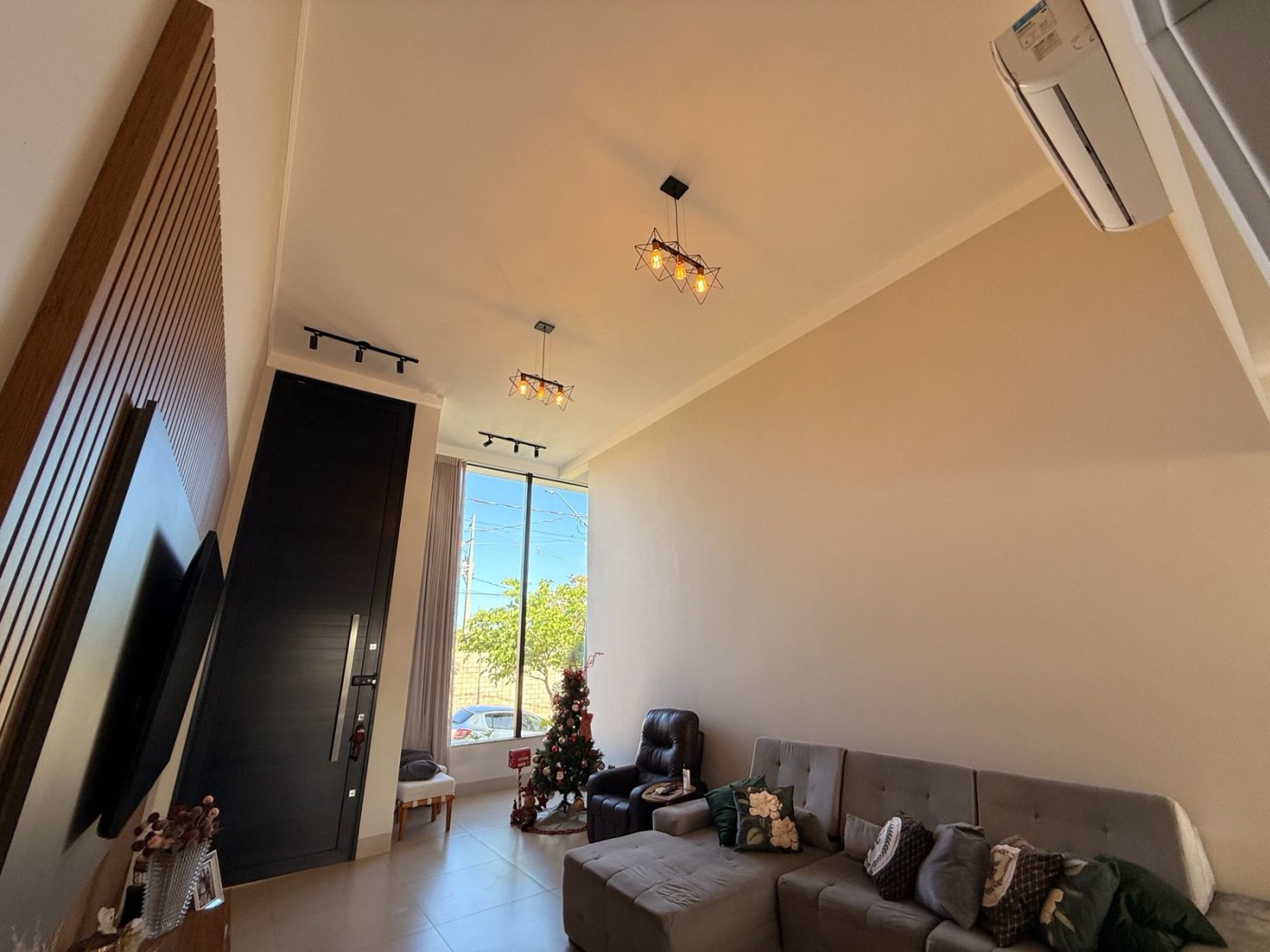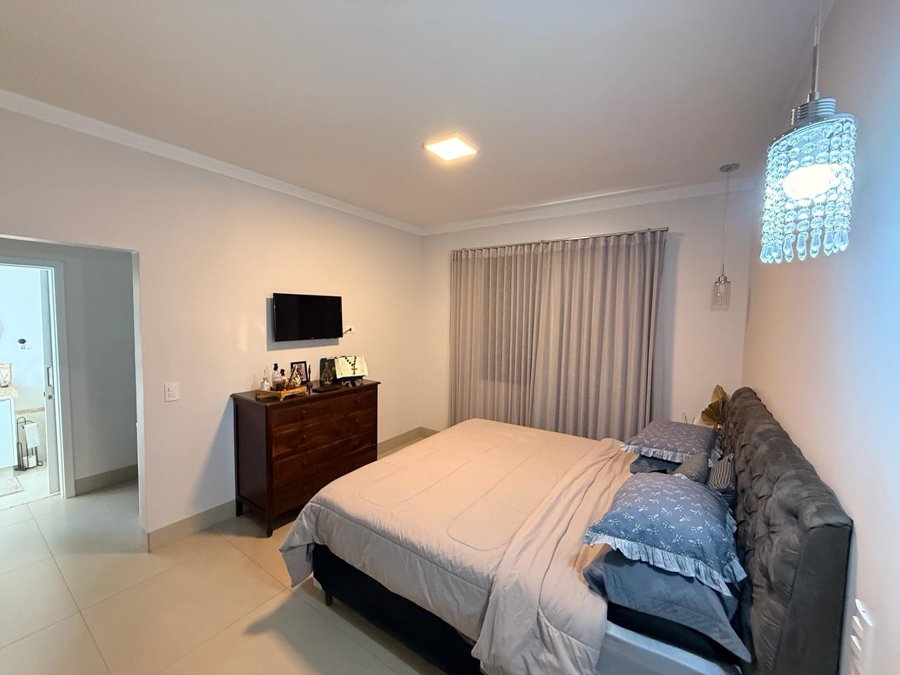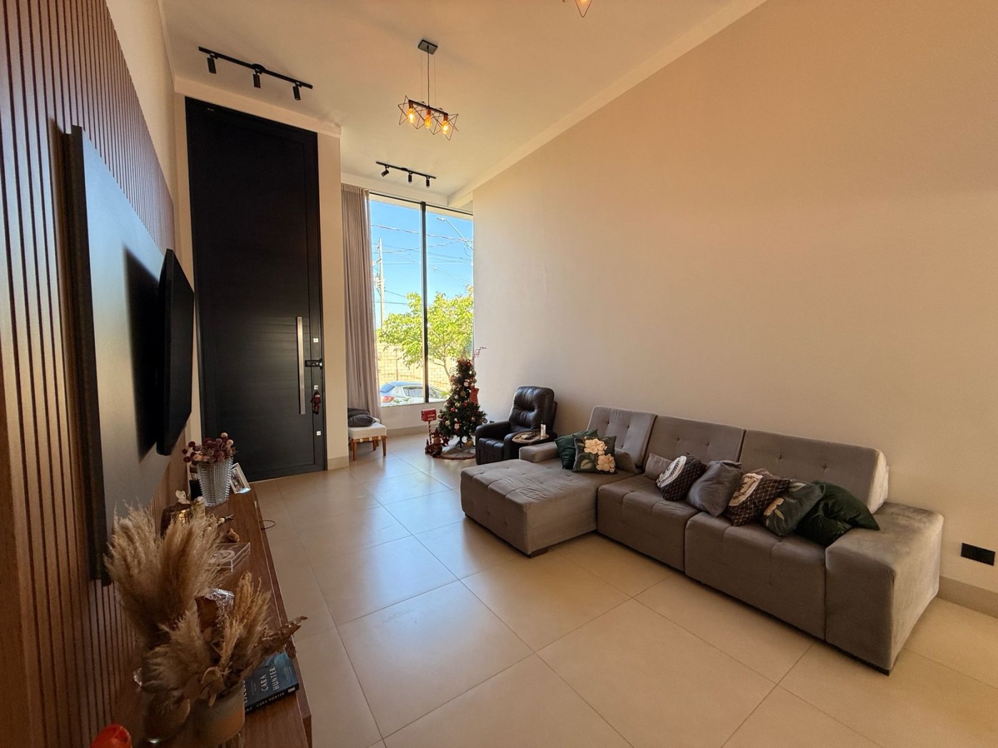 Casa ampla e sofisticada, projetada para oferecer conforto e praticidade. A sala principal possui pé-direito alto, destacando-se pela sensação de amplitude e luminosidade. Conta com painel e rack planejados, integrando-se perfeitamente à sala de jantar e à cozinha, que dispõe de uma ilha com cooktop e armários planejados, ideal para quem busca um ambiente