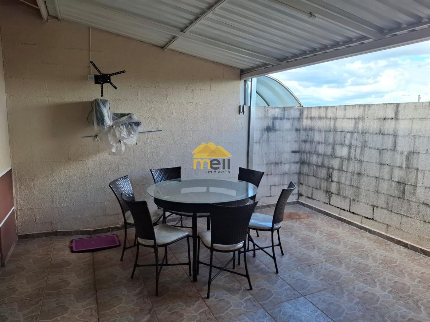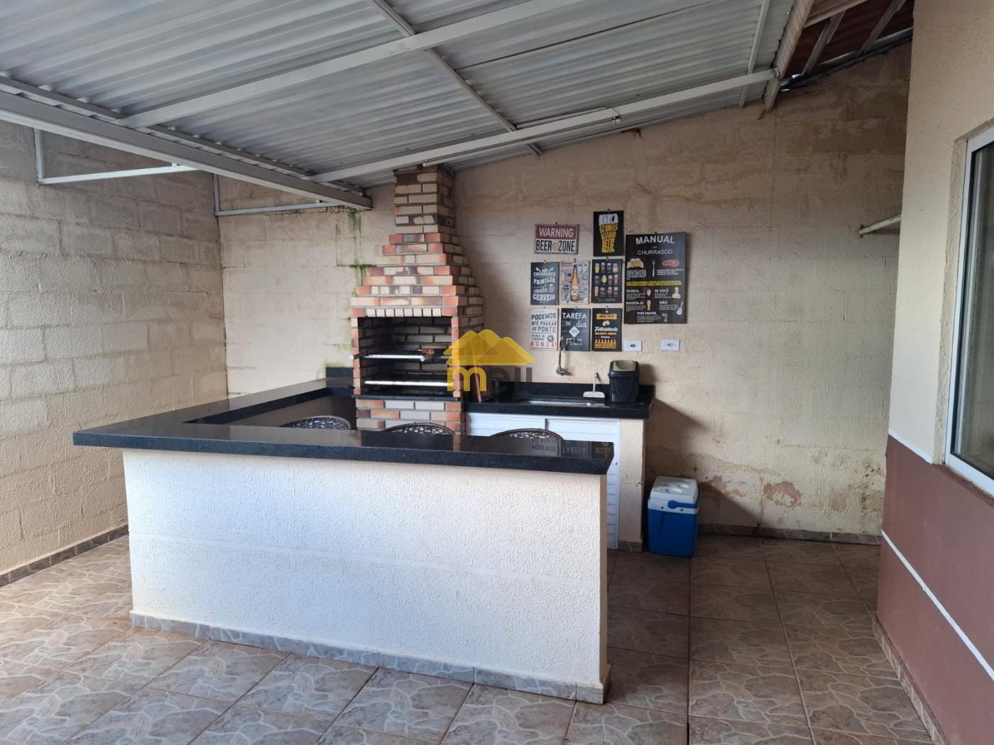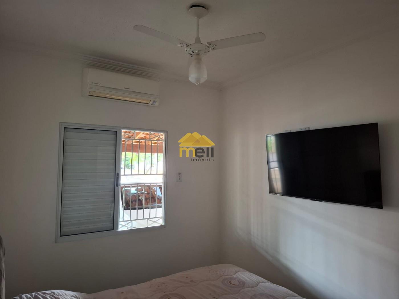 Conta com: sala de estar integrada com sala de jantar (sofá retrátil, painel de TV, mesa de jantar de 4 lugares), cozinha com armários, fogão, geladeira e depurador, 1 quarto com cama box de casal, TV, ar-condicionado e ventilador, área gourmet com churrasqueira, pia, balcão e banquetas. Garagem para 2 carros