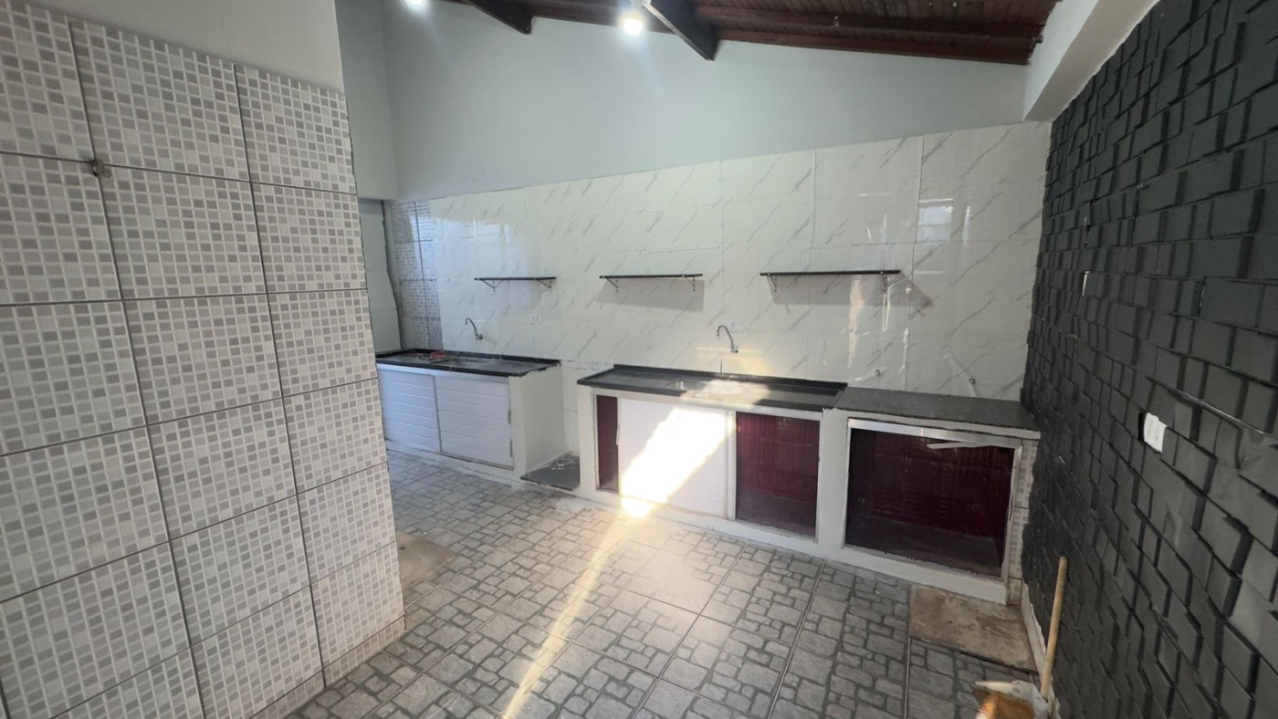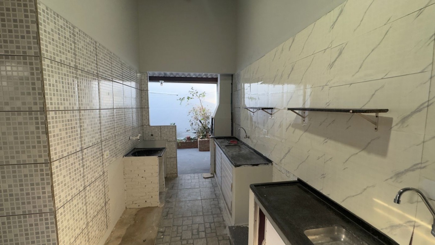 Fundo coberto com área de serviço e churrasqueira.