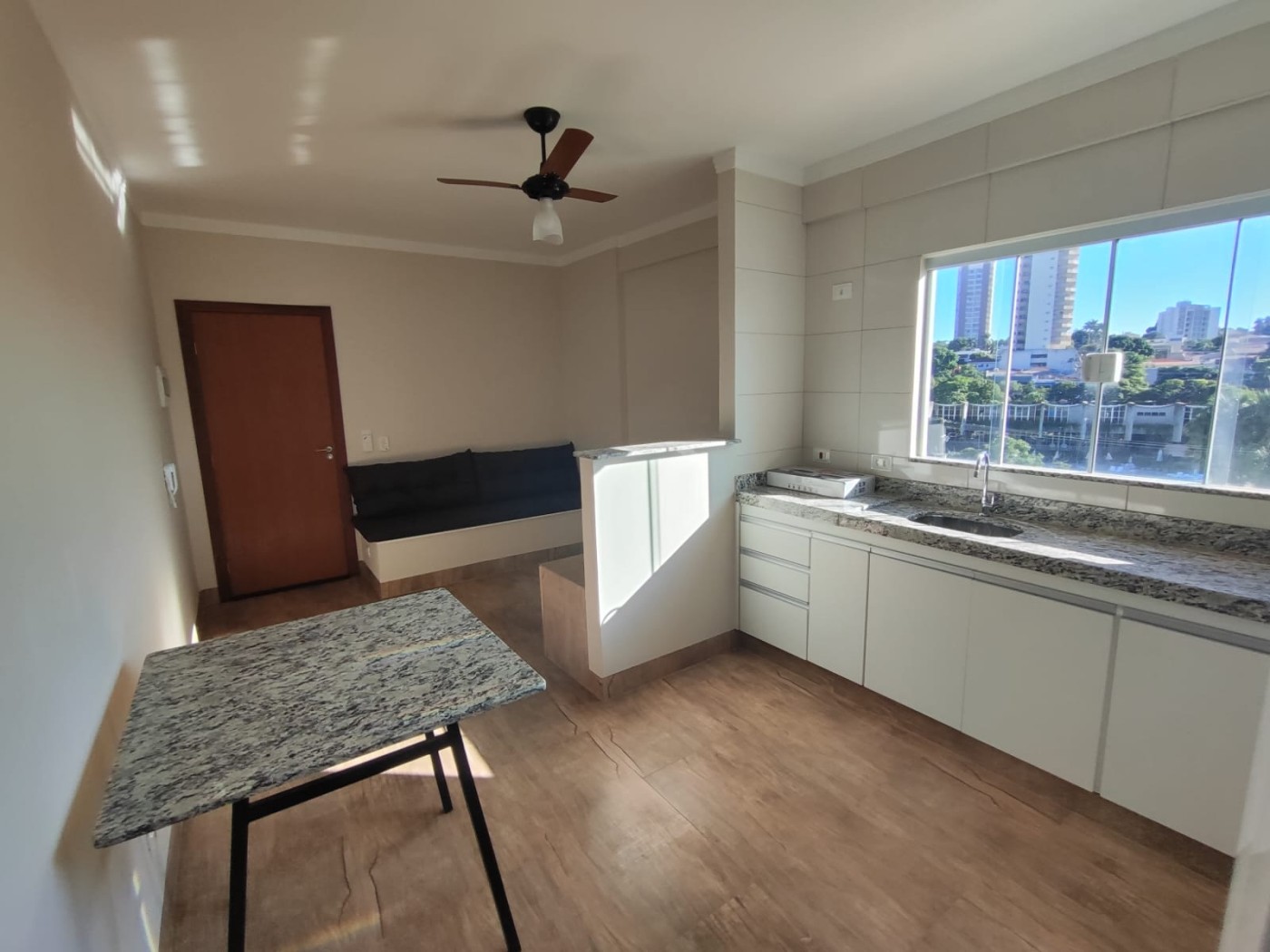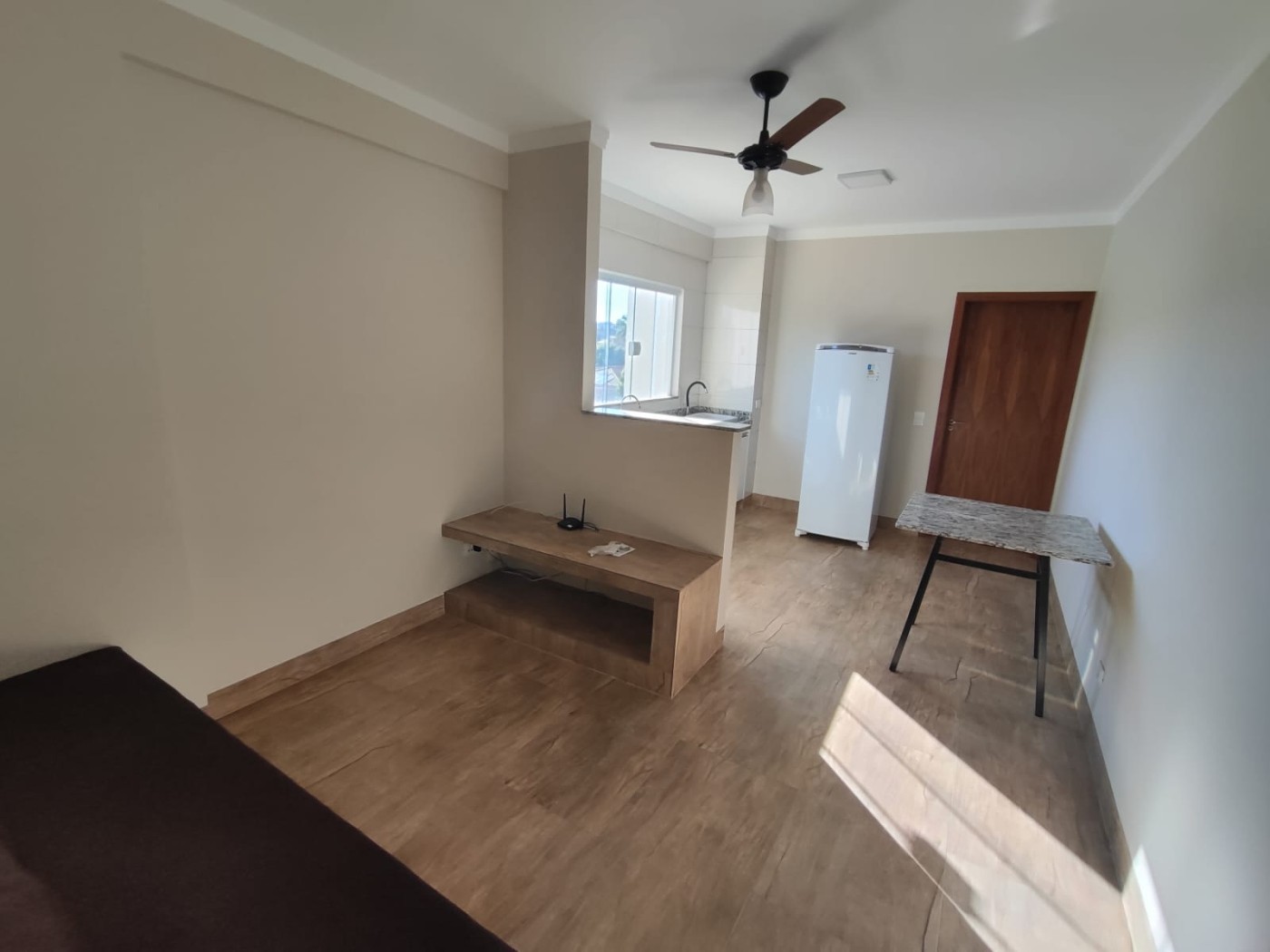 O apartamento conta com: sala de tv com sofá, estante e ventilador de teto, jardim de inverno, cozinha planejada estilo americana já com fogão elético e geladeira, 1 suíte com armário planejado, cama de casal e ar condicionado.